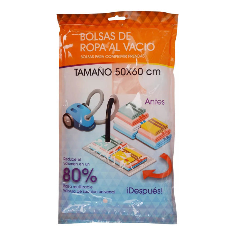 Bolsa al vacío se utiliza para almacenar, a su tamaño mínimo posible, ropas de cama, mantas, plumones, almohadas, peluches, chalecos y abrigos de invierno cuando cambia de temporada o vas de viaje. Te permitirá ahorrar hasta un 80% del espacio y mantener el orden de tu closet o maleta. La cremallera sellada de doble capa no solo puede garantizar que no haya fugas de aire cuando comprime el volumen en la bolsa, sino que también garantiza que no se verá afectado por la humedad y el polvo cuando use esta bolsa de vacío para almacenar artículos. 1. Material de alta calidad, NO tóxico e hipo-alergénico. 2. Sellado resistente al agua. 3. Duradera y reutilizable. 4. Compatible con todo tipo de aspiradoras domésticas. (NO incluida) 5. Empaque individual. MODO DE USO 1. Introduce la ropa y asegúrate de que hay suficiente espacio para cerrar la cremallera. 2. Quita el tapón y extrae el aire de la bolsa , utilizando tu aspiradora. 3. Asegura la tapa. ESPECIFICACIONES TÉCNICAS Material: PA+PE Color: transparente Medidas de producto: 50X60 CM